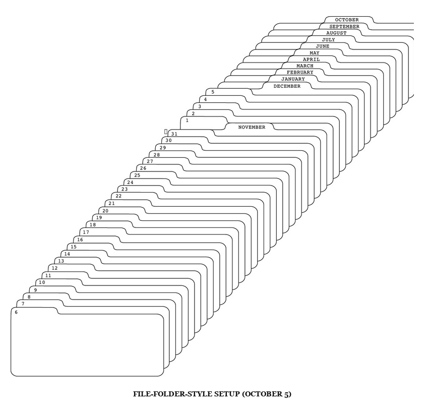 One other tool that Allen swears by in GTD is the tickler file, or suspense file [3]. It is a technique for ensuring that you are reminded of tasks/projects/notes at a particular time. You could implement this with physical files and folders (see Fig. 1 below for the GTD version), a To-do app that supports reminders, post-it notes, etc. I spend the majority of my time working in front of my computer, and a lot of in in Obsidian, so having my suspense file right there is valuable.